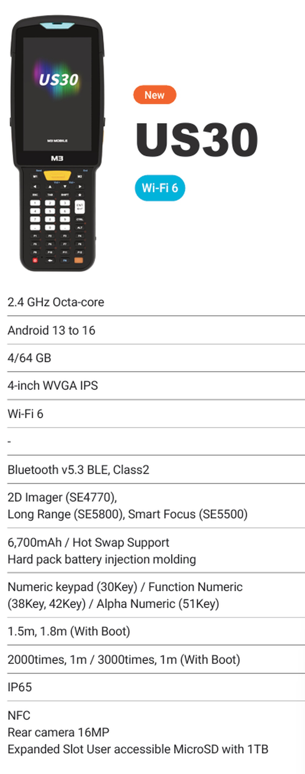 US 30 çok amaçlı kullanım özellikleri, farklı tip barkod okuyucu opsiyonları, büyük bataryası, ergonomisi ile öne çıkan M3 modelleri arasındadır.